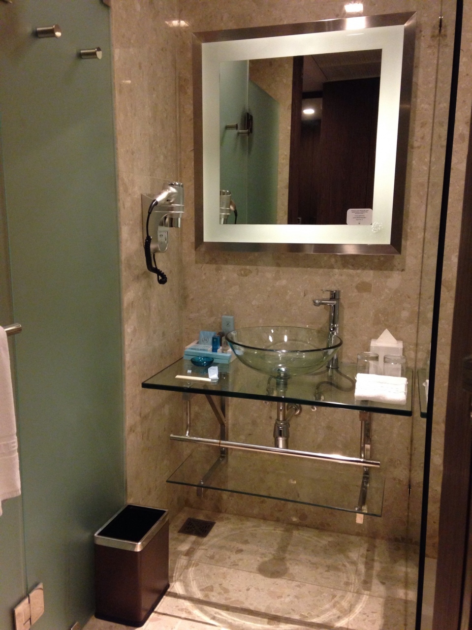 先ず、長~い廊下の先の一番端の部屋で(往きはエレベーターホールの近くでした)、ぱっと見は家具など同じなのですが、セーフティボックスはロックされたままだし、コンセントが無い!電気ポットの置いてある所にもコンセントが無くて、ハウスキーピングを呼んで聞いたら、フロアスタンドのコードを抜いて床近くのコンセントか、バスルームのシェイバー用のコンセントを使えとのことでした。