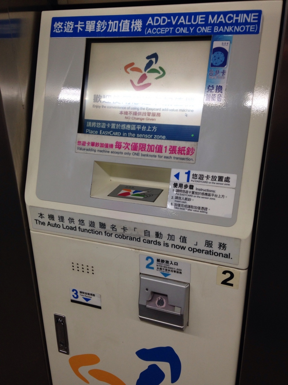 駅の自動券売機の隣にEasy Cardのチャージ機がありました。カラフルなカードの絵柄ですぐわかります。絵が描いてあるうえにカードを置いて、紙幣を挿入して、「続ける」みたいなボタンをタッチすれば、チャージ完了!領収書をプリントするか?と出るので、これはどちらでも。