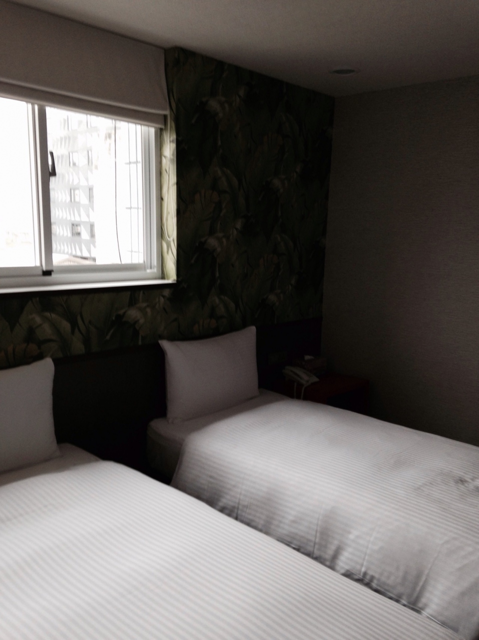 客室は、日本のビジネスホテルみたいです。窓は無いと覚悟していましたが、偶然にも角部屋で窓があり、ラッキー。
