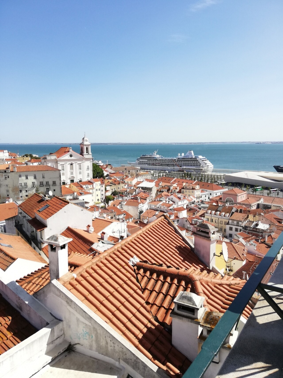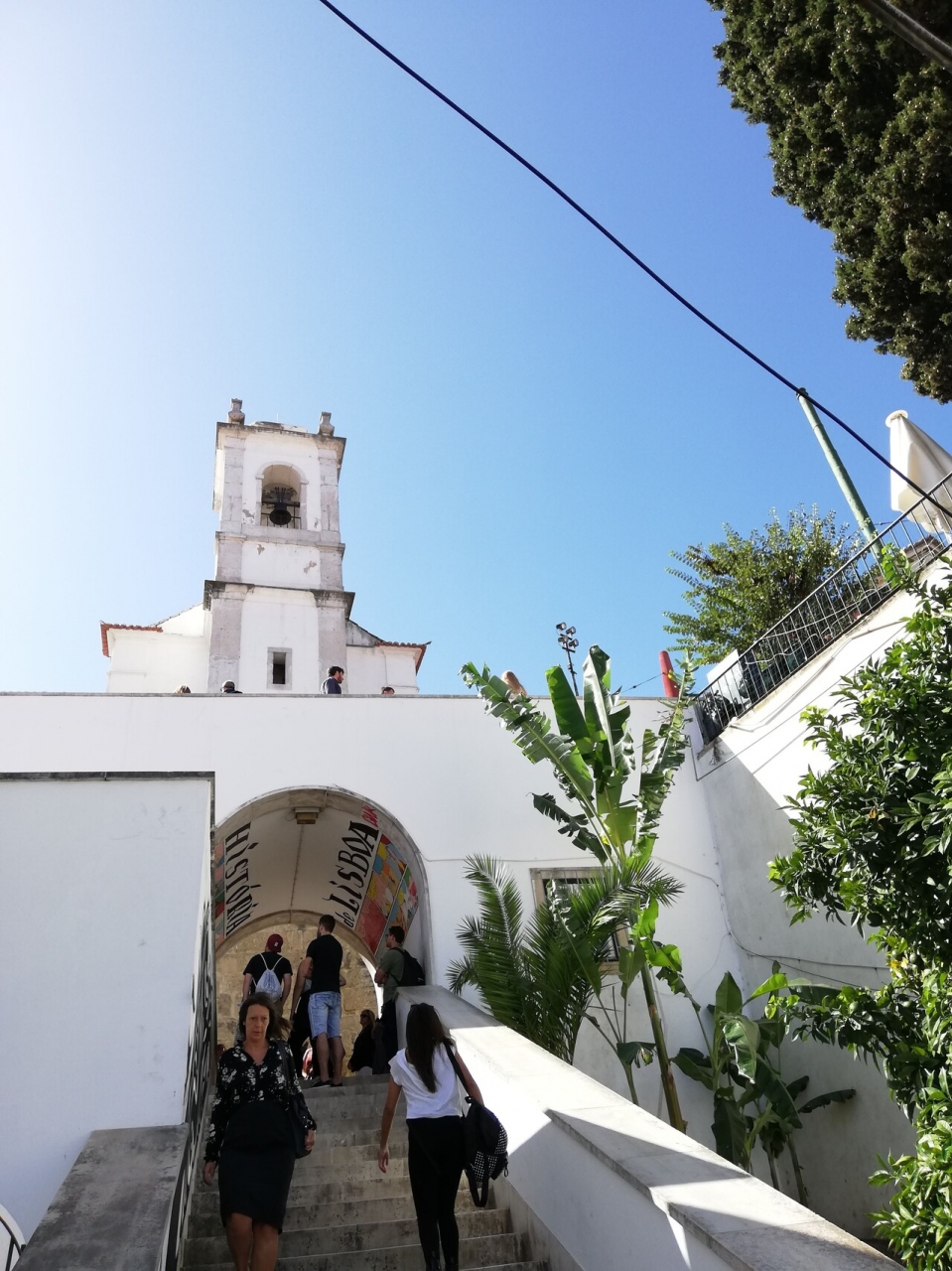 展望台からはリスボンの街とテージョ川が一望できます。トイレには有名な落書きもあり、周辺の壁画アートも楽しめます。