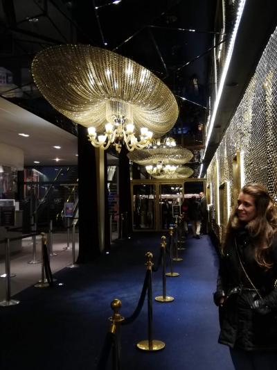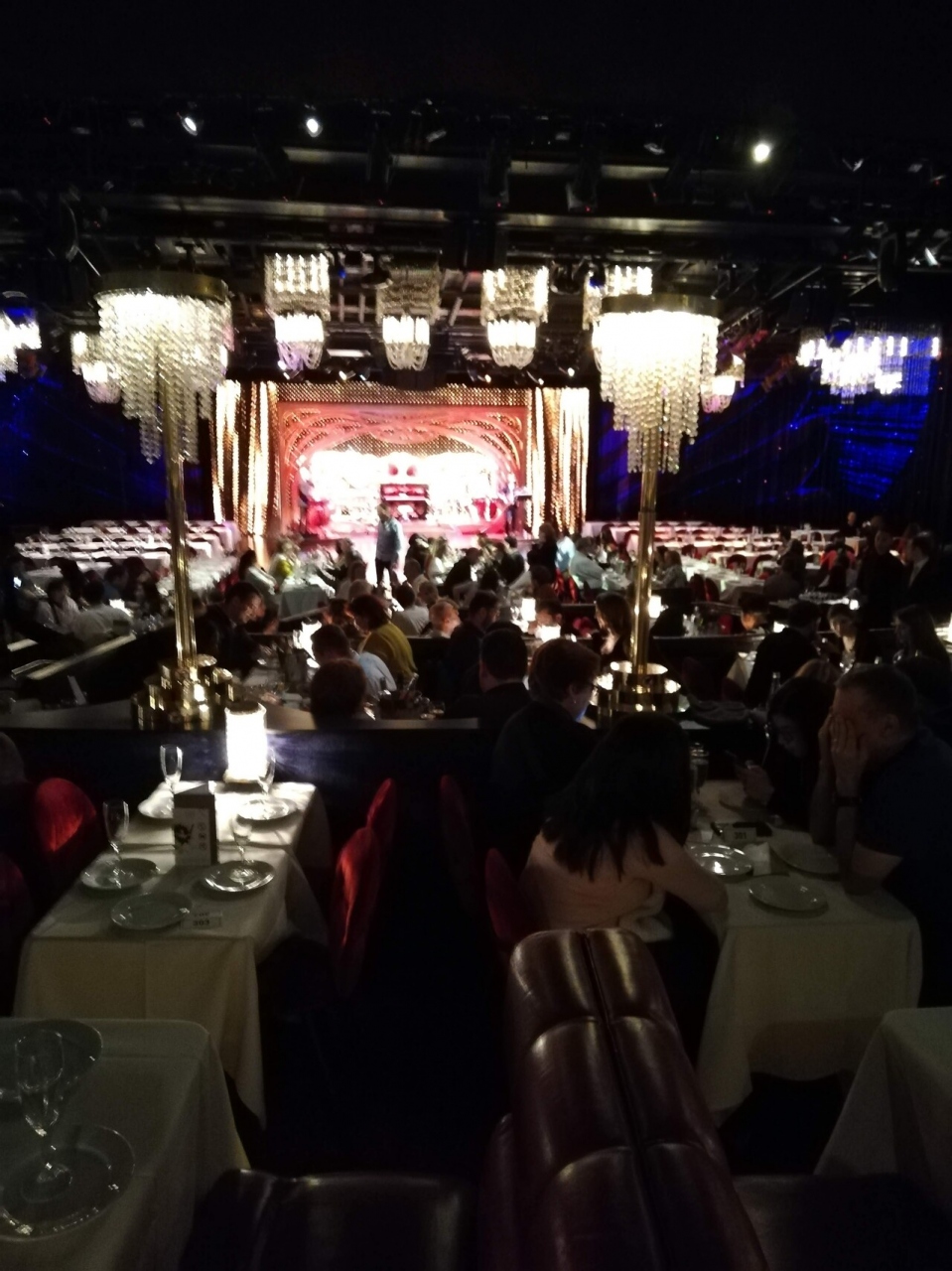 シャンパン1/2本付き(二人でシャンパン1本)のチケットで入場しました。ショーの間は撮影禁止ですが、前座のミュージシャンなので一枚。ショーが始まる時には、シャンデリア風のライトは収納されました。