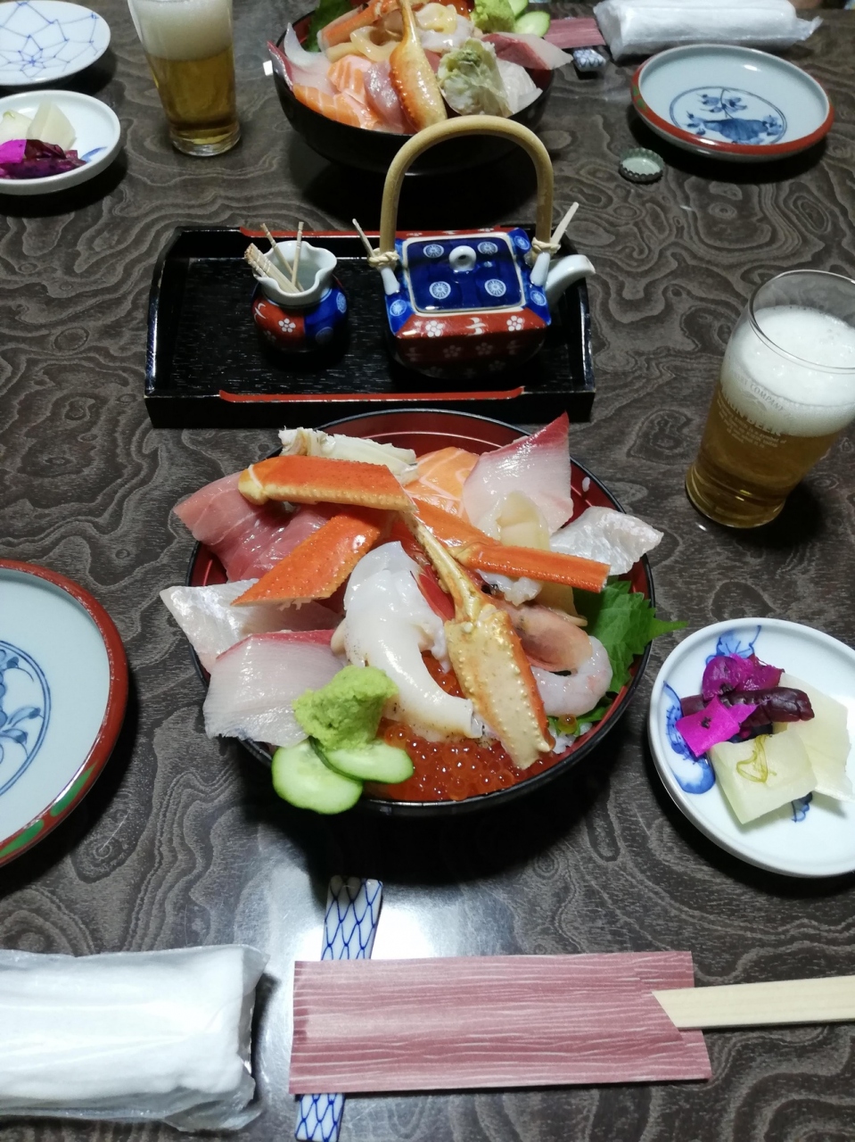 お部屋での夕食もリラックスできました。近江町市場が近いので海鮮丼も豪華でした。3泊したので、海鮮丼、会席料理、最終日は夕食無しで外食、と電話で調整してもらいました。