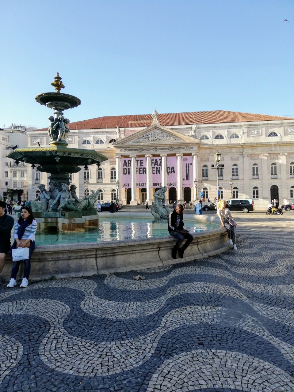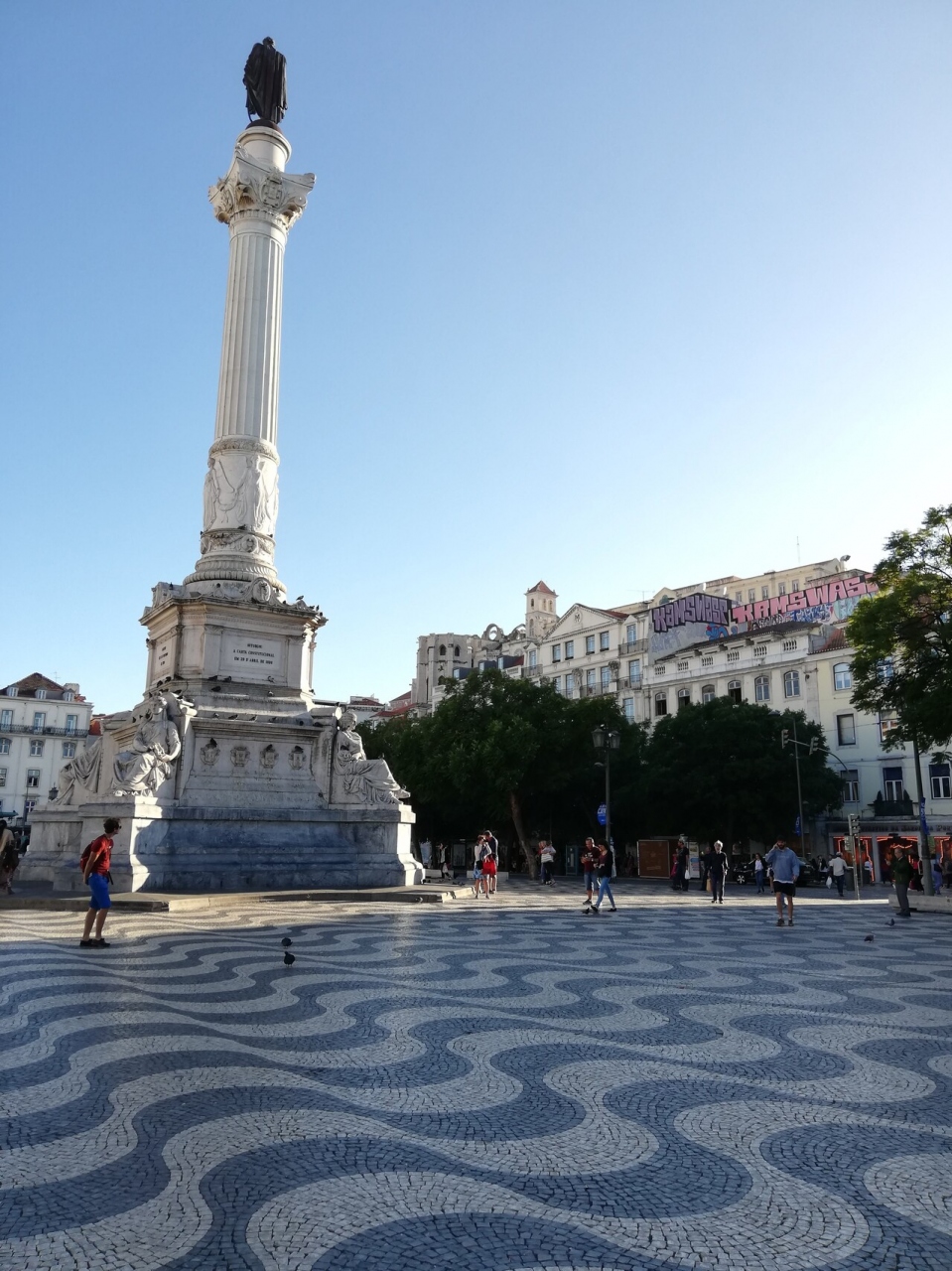 波打つ模様の石畳の広場の中に、南北に2つの大きな噴水、中央には高い円柱にドン・ペドロ4世像。周りの交通量は多いのですが、広いのでここは街中のオアシスになっています。