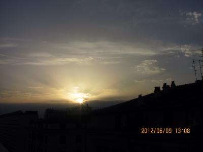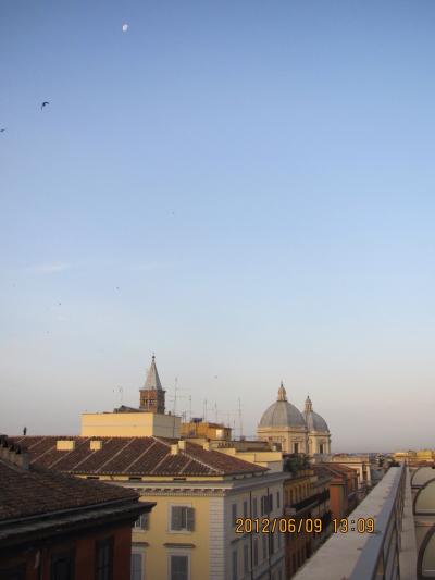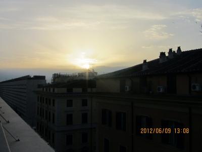イタリア最後の朝です。テラスに出ると朝日が。まだ冷んやりして涼しいです...