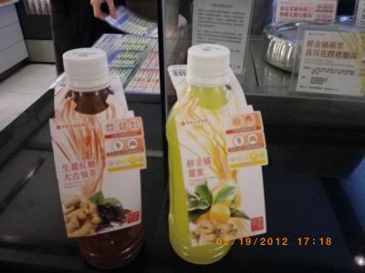 温かいお粥(?)みたいなのから注文して作ってもらうフレッシュジュースから、ペットボトルのオリジナルドリンクまで。その後移動しなければいけなかったのでペットボトルのゆず茶を選んだのですが、さすが漢方、温かいのを選べます。