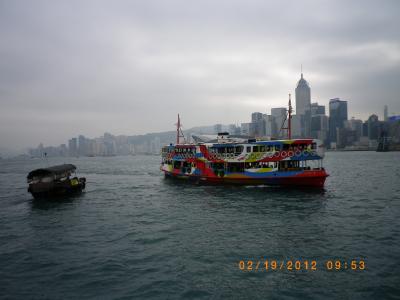 2月に乗ったので結構風が強く、揺れるし寒かったです。冬は防寒対策が必要でしょう。スターフェリーの☆印がいたるところについていて、座席も星型に穴が開いていて可愛いです。- 旅行時期