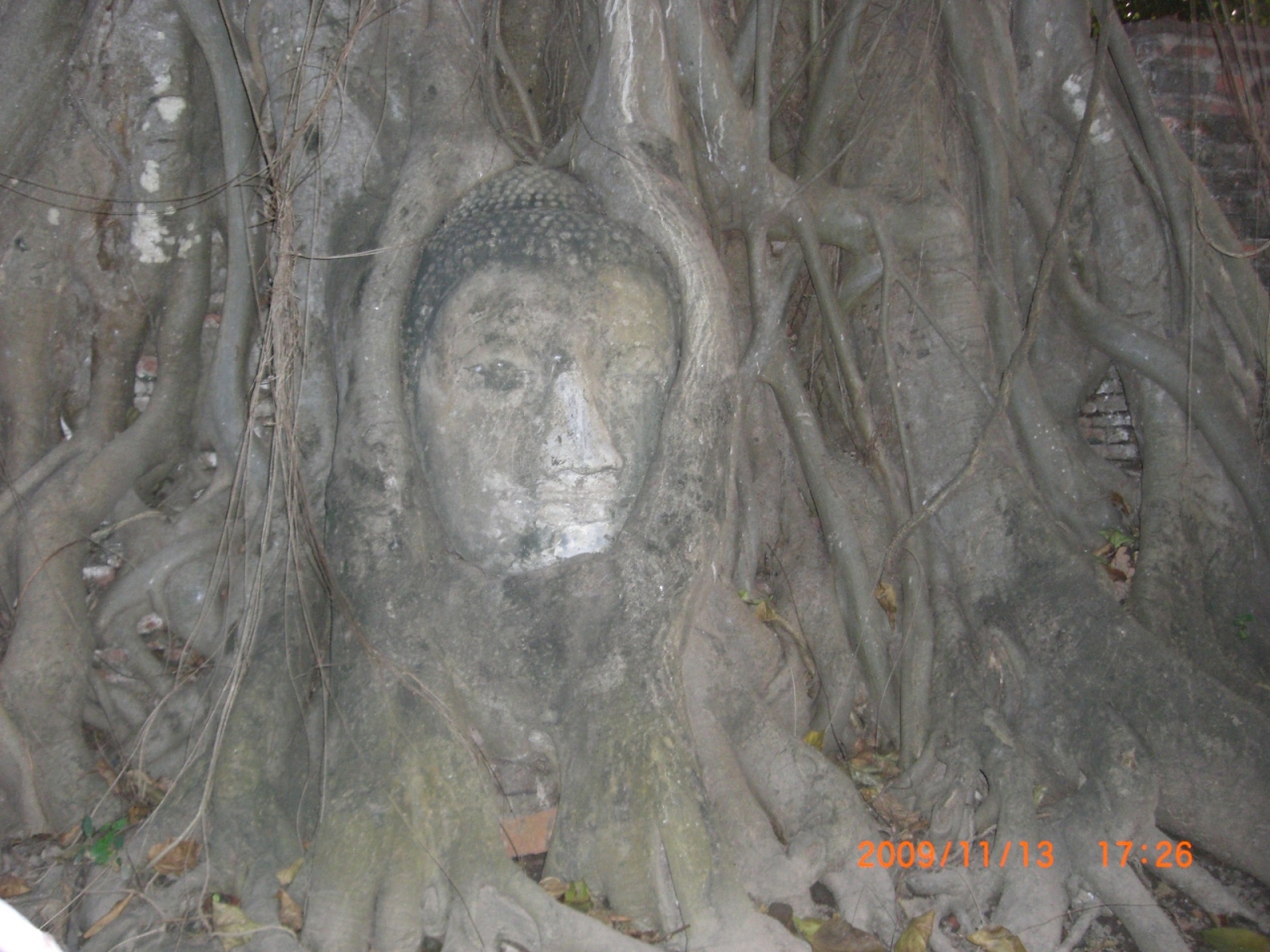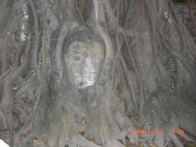 過去のビルマ(ミャンマー)軍の攻撃でクビをきられた仏像がたくさん。その中でも地面に落ちた仏像の頭部を木が覆って一種の芸術作品になっているのがこのお寺の仏様。