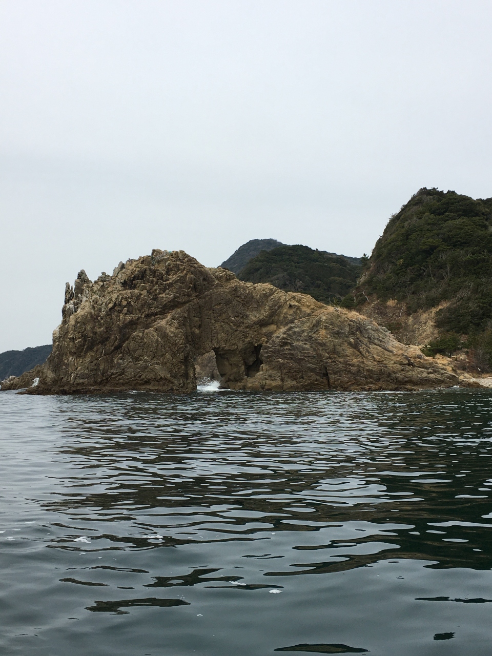 センザキッチンに船の乗り場があります。青海島の遊覧船コースは当日の波の状況によって決まります。ちょうど訪問した日は天気はよかったのですが、波が高く一周コースは中止となり、赤瀬コースという一番短いコースになりました。