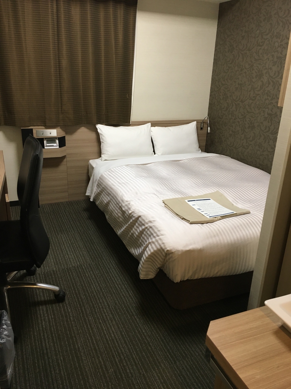 観光で山口県を訪問し、宿泊しました。新幹線のホームから丸見えの部屋でしたが、カーテンを閉めればそちらは気になりません。ビジネスホテルの部屋としては、広い造りで、ベッドルーム、ユニットバスともに、2人で泊まるのに狭いという感じはありませんでした。