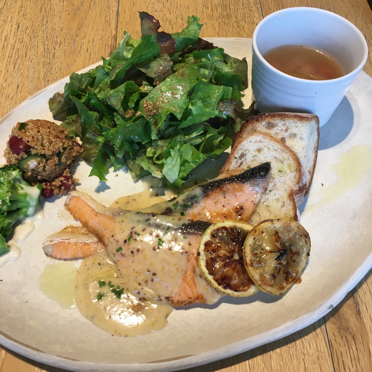 サーモンステーキのメニューを選択。サラダ、副菜、メインのサーモン、スープなどがついてきましたが、ボリュームのわりには値段は高いです。