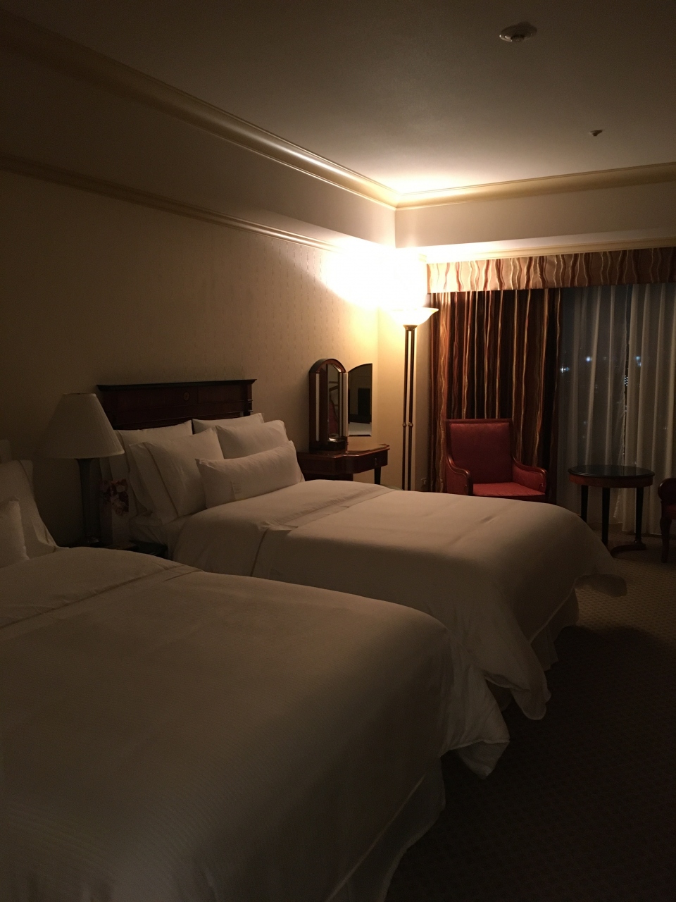 客室内は高級感あふれる調度品が置かれていて、豪華な造りです。ツインルームでしたが、ベッドもダブルベッドサイズが2台置いてあっても、部屋の狭さは全く感じませんでした。