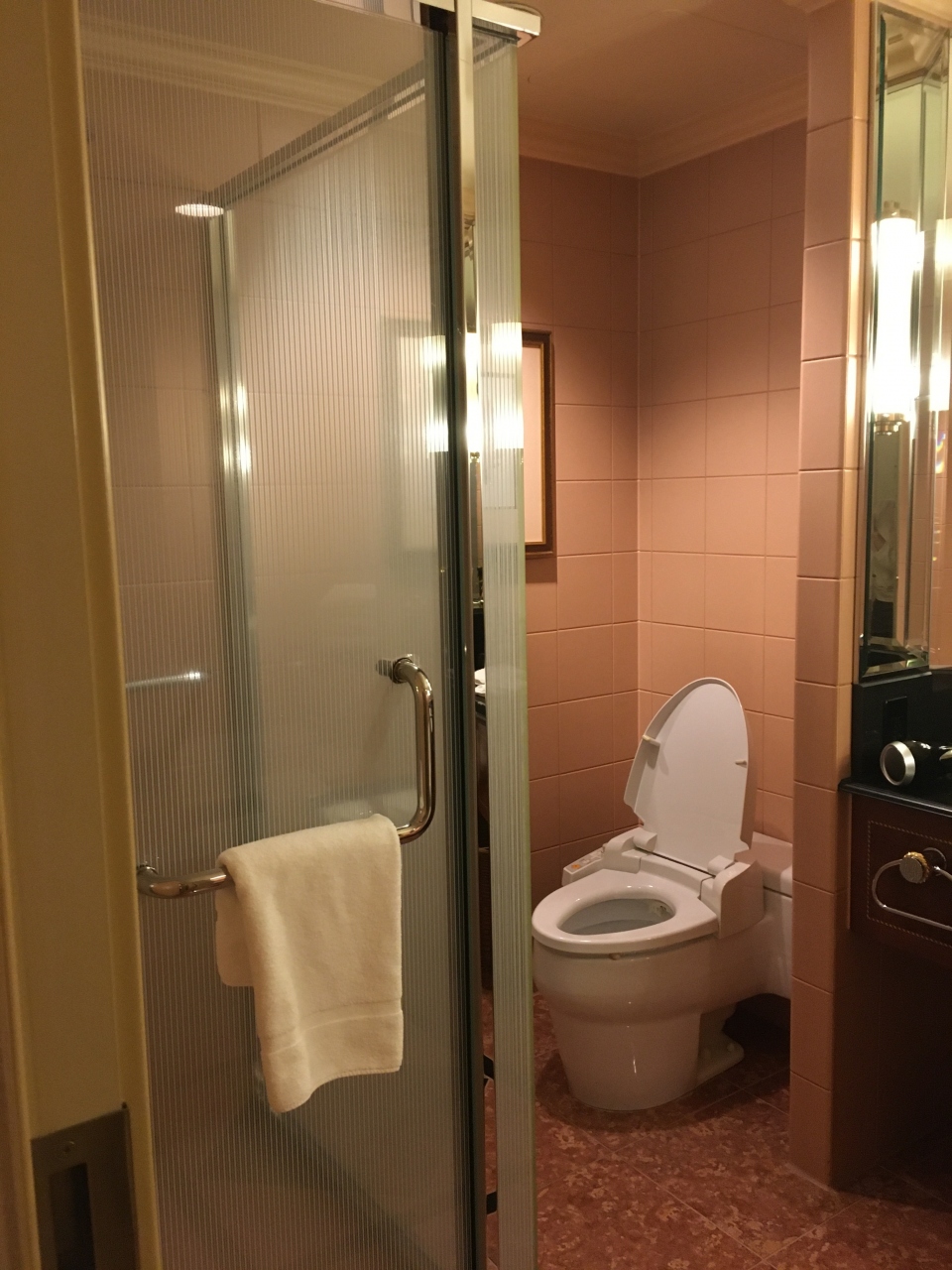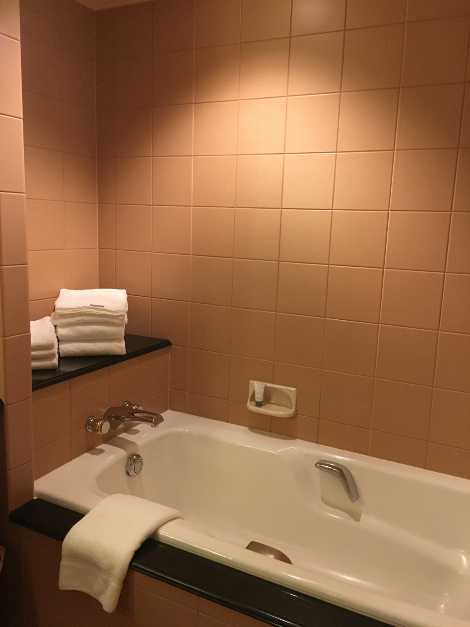 バスルームはビジネスホテルのわりには少し広めです。部屋の内装はきれいでしたが、ホテル廊下の壁などはところどころ壁紙が禿げていたり、少し古さを感じました。また、ビルが少し古いのか、入浴後から排水の臭いが気になり始めました。