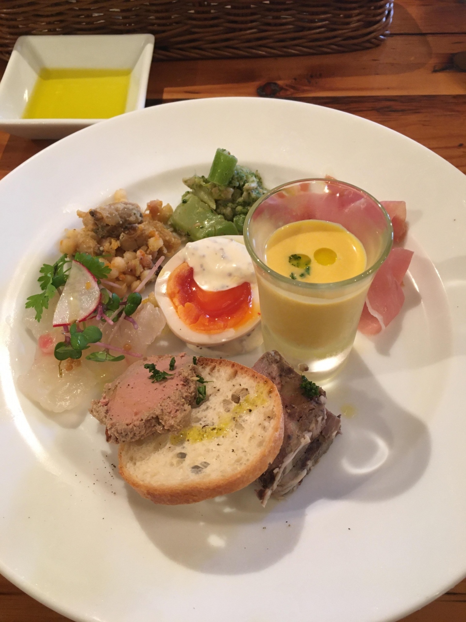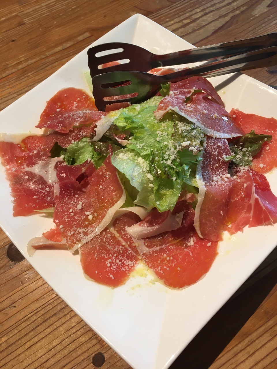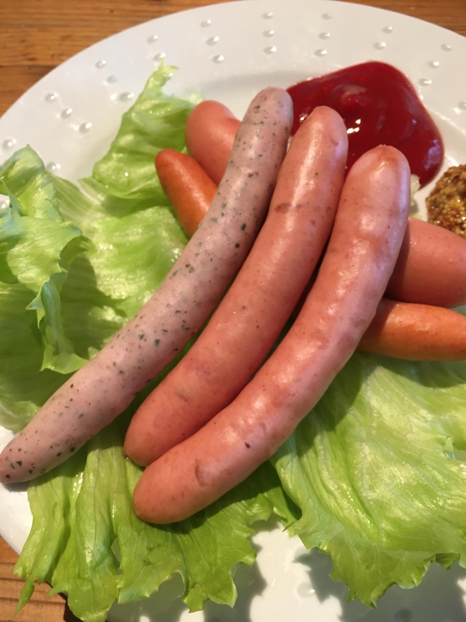 生ハムサラダ、ピザ、ソーセージを注文しました。ソーセージは水上温泉で人気のある「育風堂」のものを食べることができます。