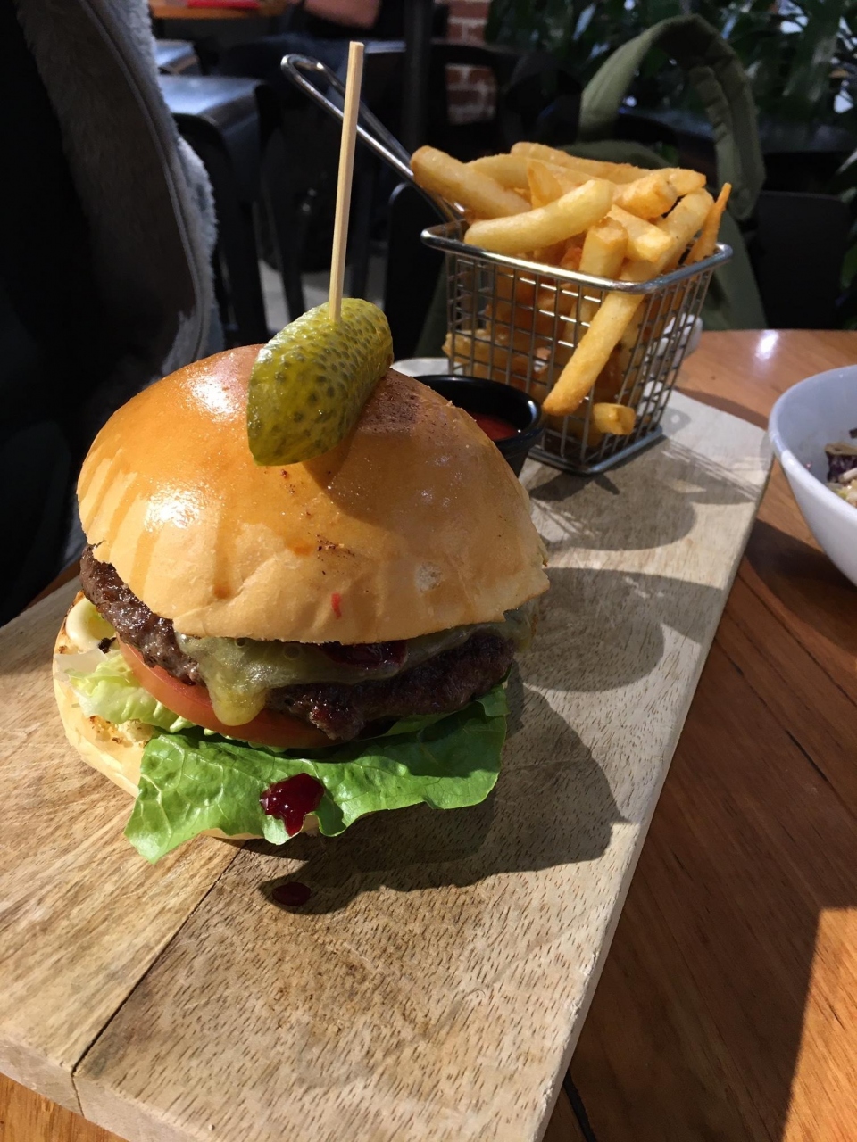 外の屋根がついたテラスでランチを食べました。ボリュームもあり、味もおいしかったです。ビール、サイダーなどが試飲として出てきました。