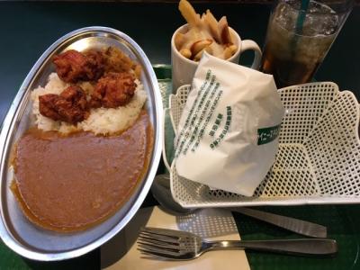 ハンバーガーとカレーを注文しました。ハンバーガーには甘辛味の唐揚げが入っています。