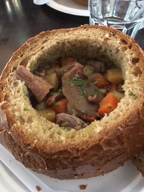 大きなパンをくり抜いた中に具材たっぷりの料理が入ったものが食べられます。