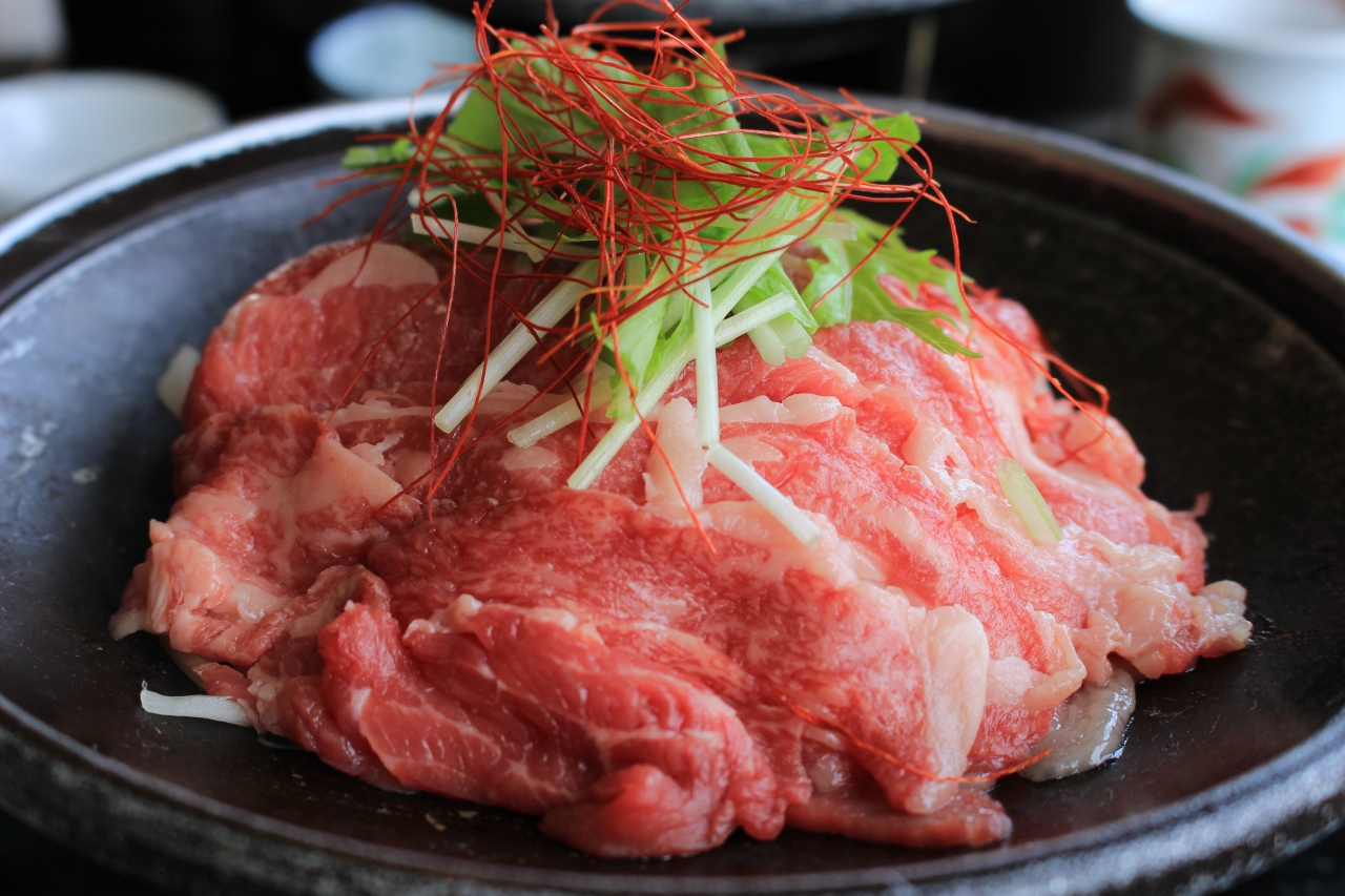 能登牛を注文すると、生のお肉が乗ったお皿が運ばれてきて、火でぐつぐつと煮えるのを待ちます。