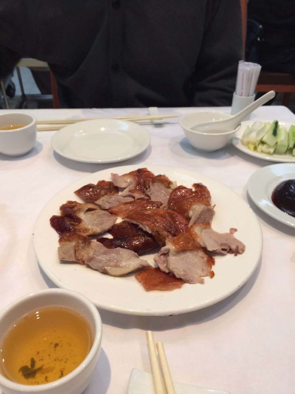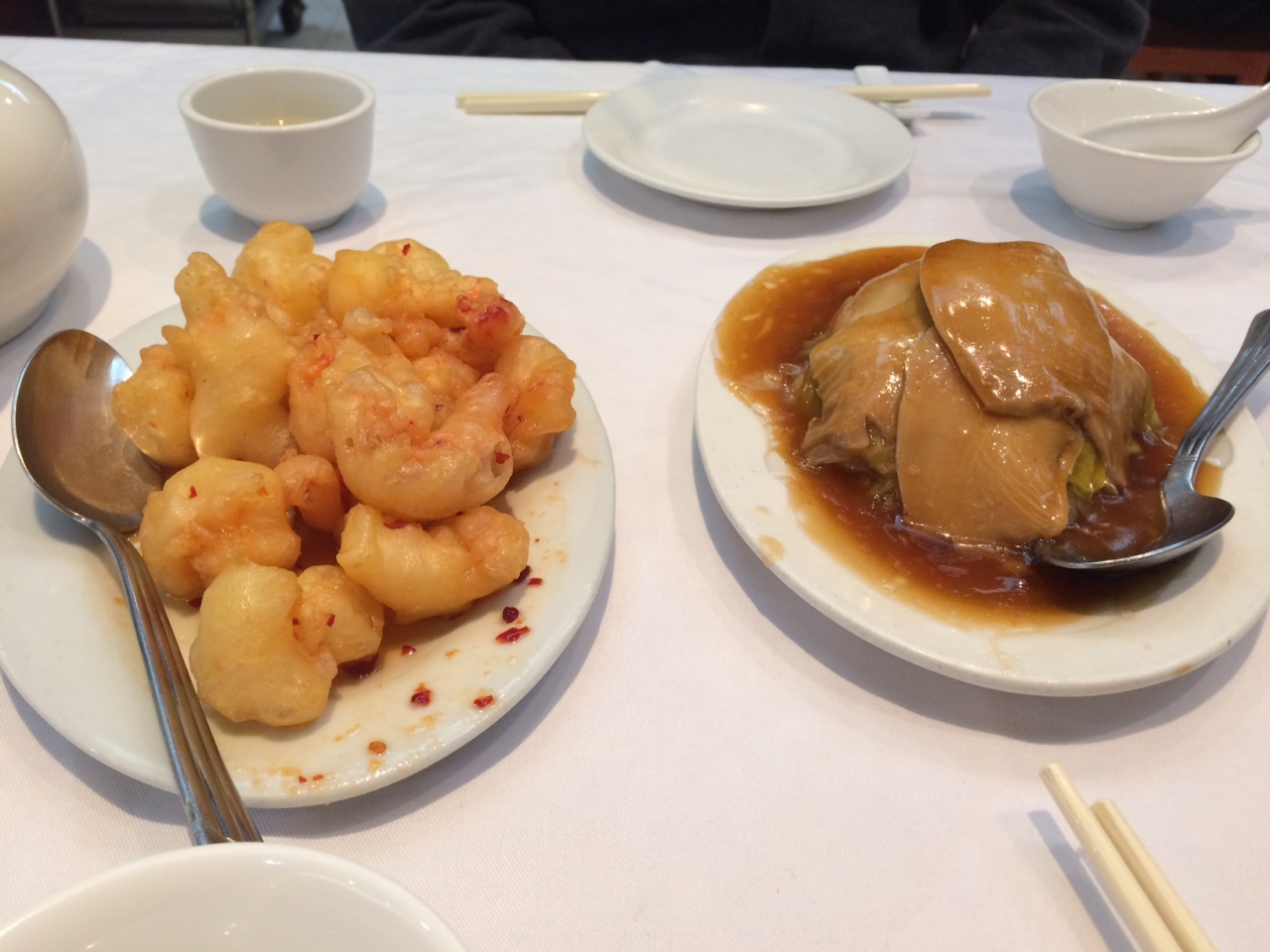 えびの衣揚げみたいな料理と、レタスとアワビの姿煮と、北京ダックです。