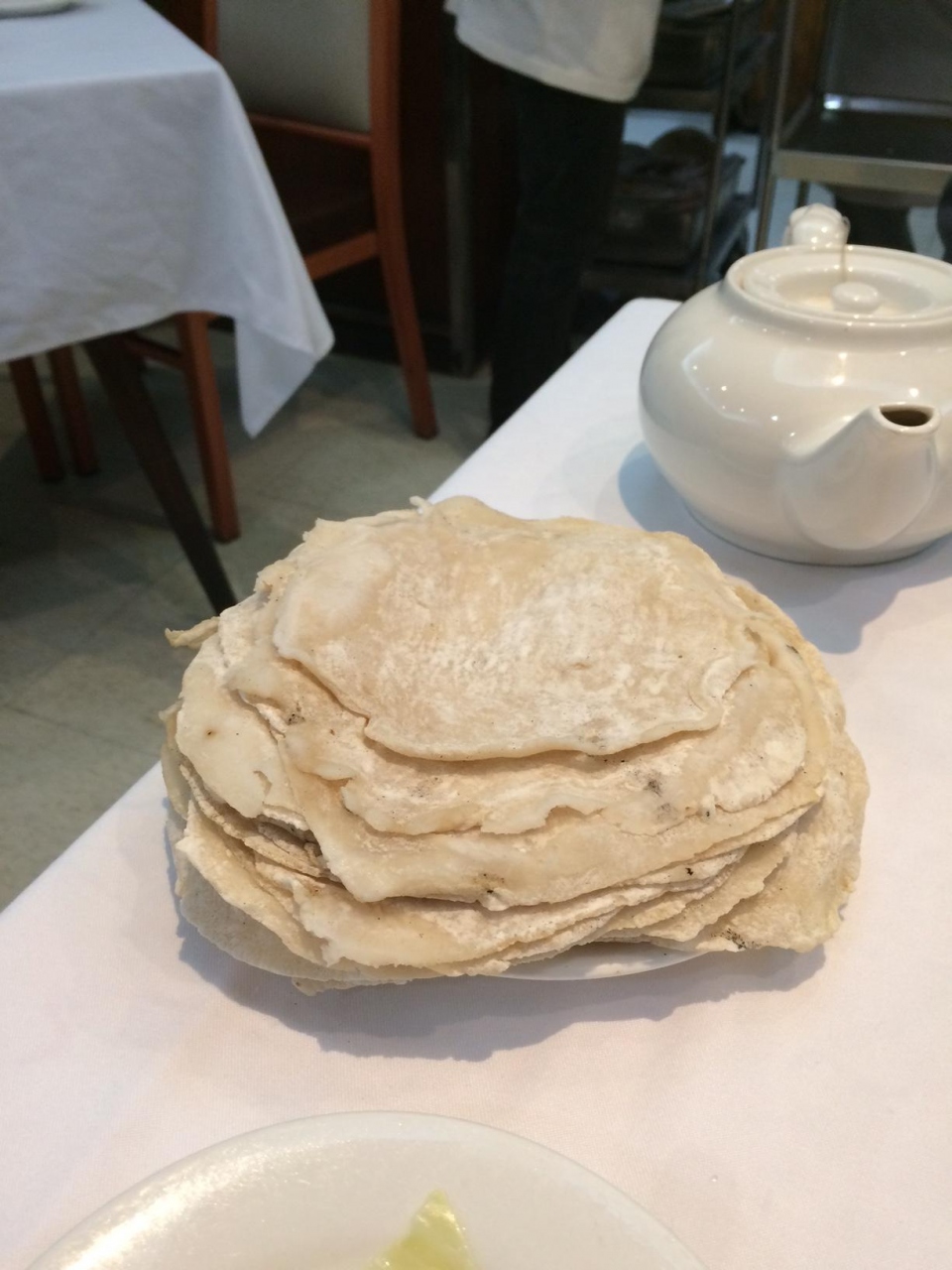 北京ダックを包む皮は日本で食べるものと違って、かなり分厚いです。皮をたくさん食べるとそれだけでお腹がいっぱいになるので、1枚の皮に北京ダックを何個か入れて食べないと食べきれません。