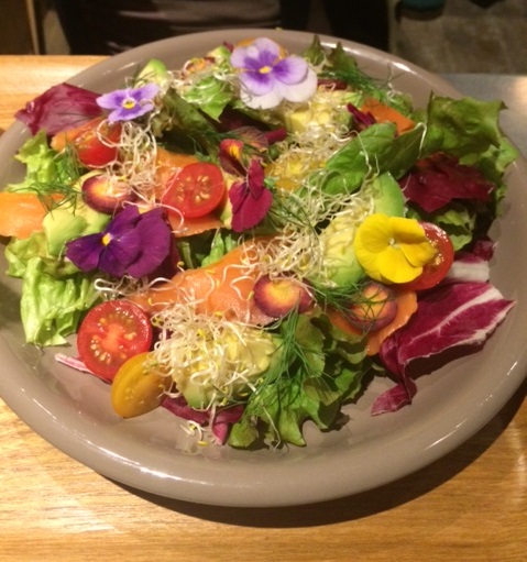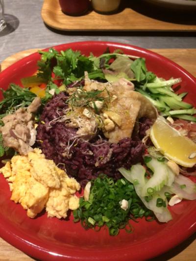 パクチーをつかったチキンライスのプレートを頼みました。知人が頼んだサラダのプレートはお花がのっていてとてもおしゃれでした。