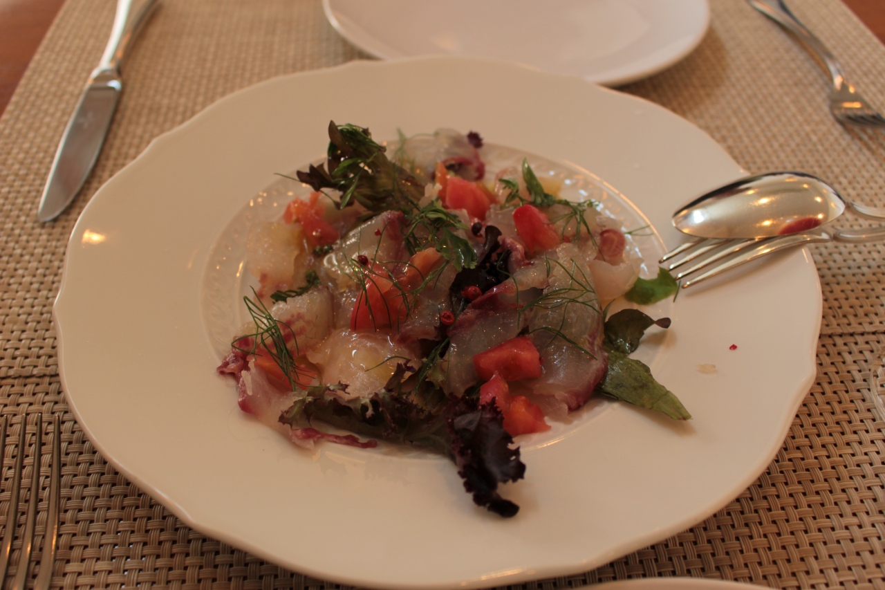 黒鯛のカルパッチョは魚がとても新鮮でおいしかったです。また、パテもボリュームがあり、味もしっかりしていました。全体的に塩味が濃い料理が多いですが、味付けはどれも良かったです。