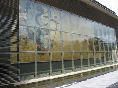 美術館に入る前には、ガラス張りの壁の向こうに金屏風の絵画があり、圧巻です。