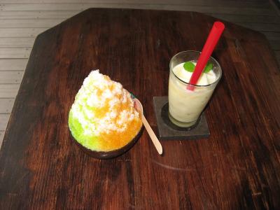 席は室内とテラス席があります。かき氷とスムージを注文しました。