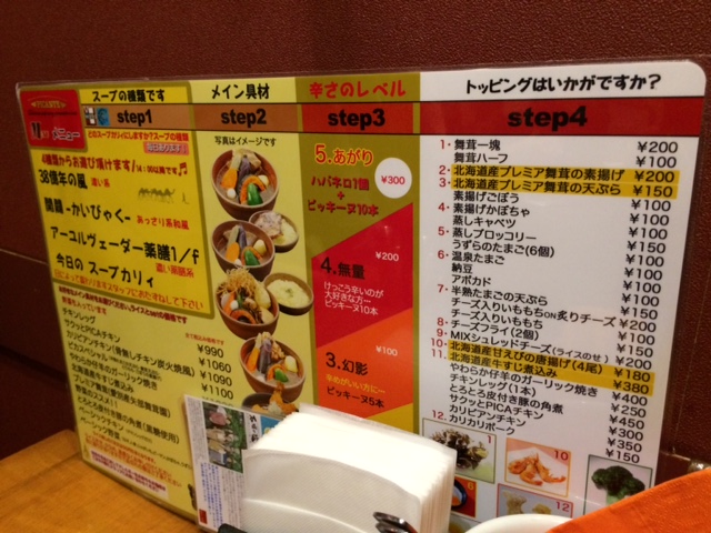 スープの種類、メイン具材、辛さ、トッピングといろいろ選ぶことができます。メニューにはアーユルヴェーダ薬膳といった体によさそうなものありました。