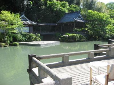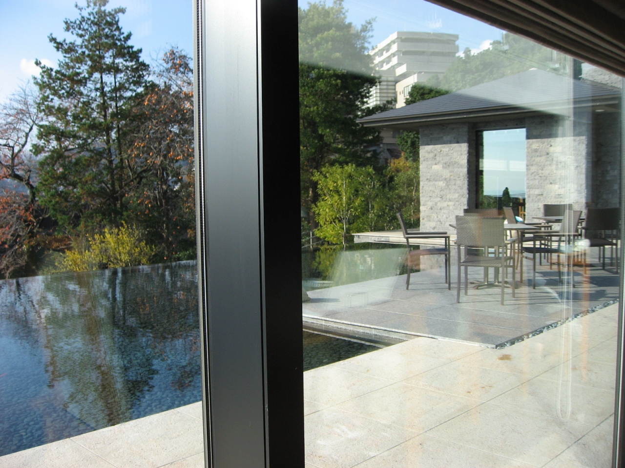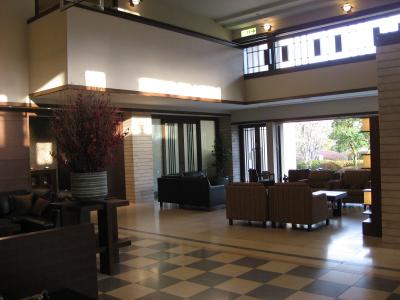 ラウンジやロビーでは能舞台のある池を眺めながら、いすに座って、のんびりすることも出来ます。また、泊まってみたい宿の一つです。- 旅行時期