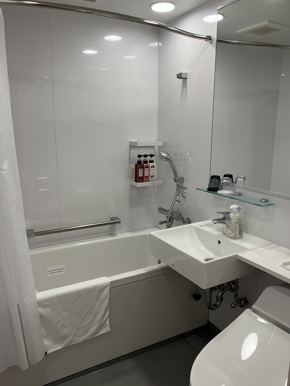 ホテルはまだ新しいので、客室も広く清潔感があります。お風呂は通常のビジネスホテルに比べてゆったりした造りで、洗面台も洗面ボウルが大きめなので、使いやすいです。