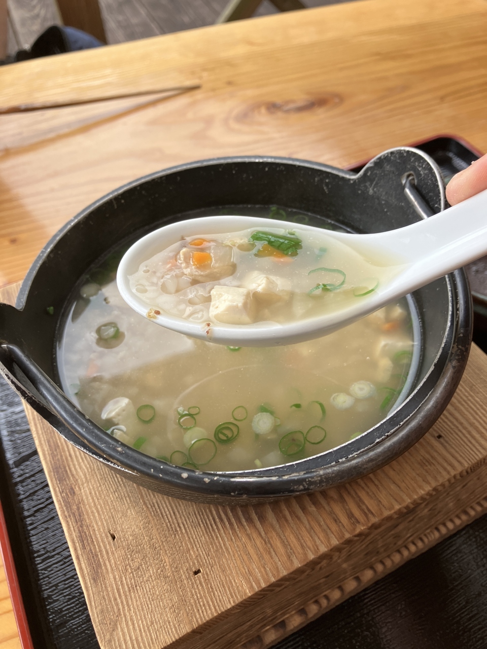 そば料理以外にも、鮎の塩焼きや、でこまわし(味噌田楽のおでんみたいなもの)、そば米雑炊などがメニューにあります。そば米雑炊はメニュー上には他の料理とセットでしかありませんでしたが、店員さんに単品で注文可能か聞いたら、単品も用意してくれました。