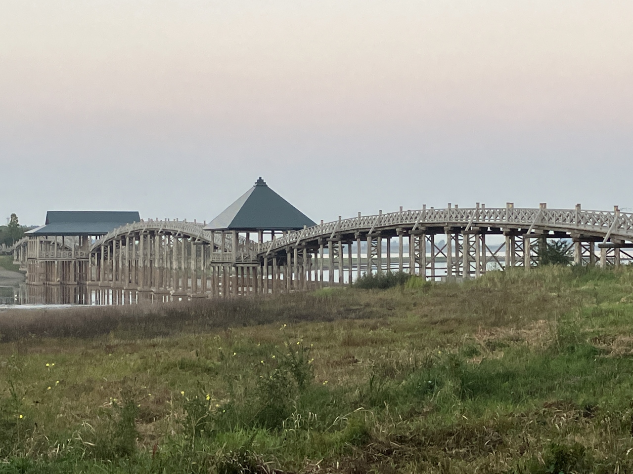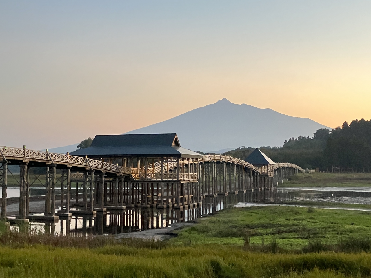 橋の反対側からのほうが、橋全体がきれいに見え、津軽富士も見えるため、ベストスポットです。湖に鶴もいました。
