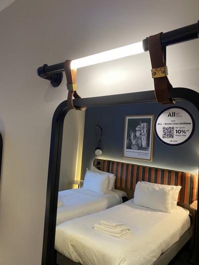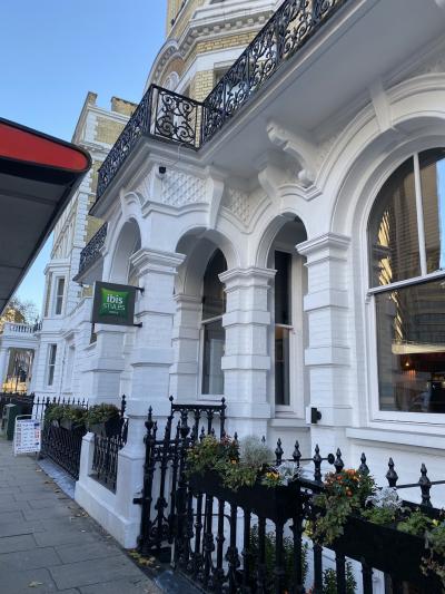 グロスターロードから徒歩で2分くらい。とても便利な立地です。建物は歴史ある雰囲気ですが、室内は新しいです。カーペットの柄は地下鉄のプラットフォーム。ベッドボードはシート、吊り革もある!鉄道好きで無くても面白いと思いました。
