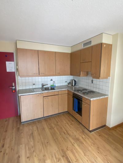 キッチンのあるアパートメントタイプの部屋です。外食に飽きたときは近くのコープで買ってきて簡単な調理ができます。鍋やフライパンなどのキッチンツールセットを無料でフロントで貸し出してくれます。前にホテル棟があるのでアイガーフロントではないですが3階の部屋からはアイガーの頭が見えます。朝食も美味しいです。