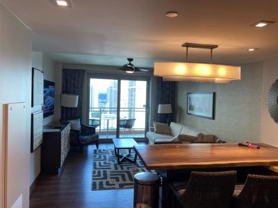 ヒルトンビレッジの中にあるので、買い物や食事に便利です。でも、キッチンもあるので近くのスーパーで食材を買って調理する事もできます。洗濯機や乾燥機も部屋の中にあるので、ビーチやプールのあとの洗濯がいつでもできます。金曜日の花火も楽しいイベントです。