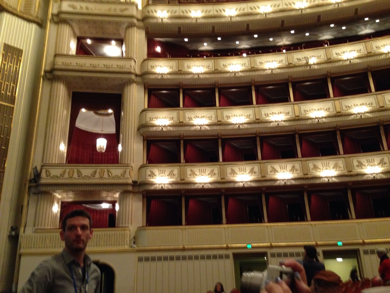 ウィーンのオペラ座の日本語見学ツアーに参加しました。とても上手な日本語で説明しながら案内してくれます。40人くらいいました。この日は19時からファウストの公演がありその準備をしていました。観客席に座ることが出来ます。さらに舞台のそでに行って裏方のスタッフが大道具やせりあがりの点検をしてるのも見せてくれて、とても興味深かったです。ツアー時間は30分位です。ツアー開始の20分前からチケットを売り出すのですが、かなり行列ができています。