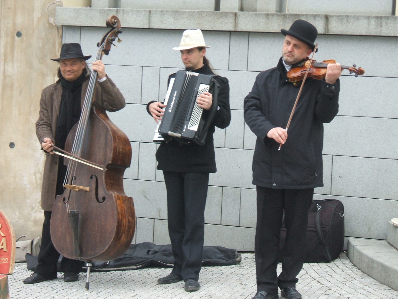 通りで楽器を抱えた男の人3人が演奏していました。