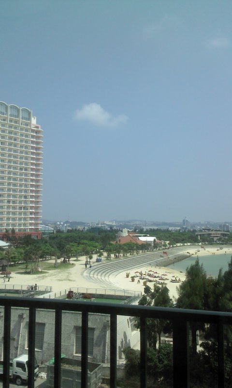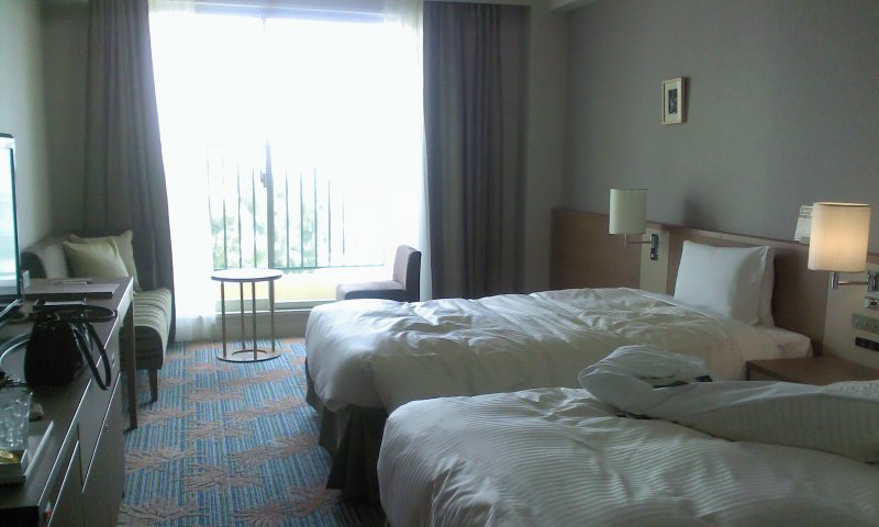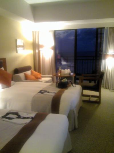 ホテルの部屋は、お値段の割には広めのツインでベランダからの眺めも海が見えて