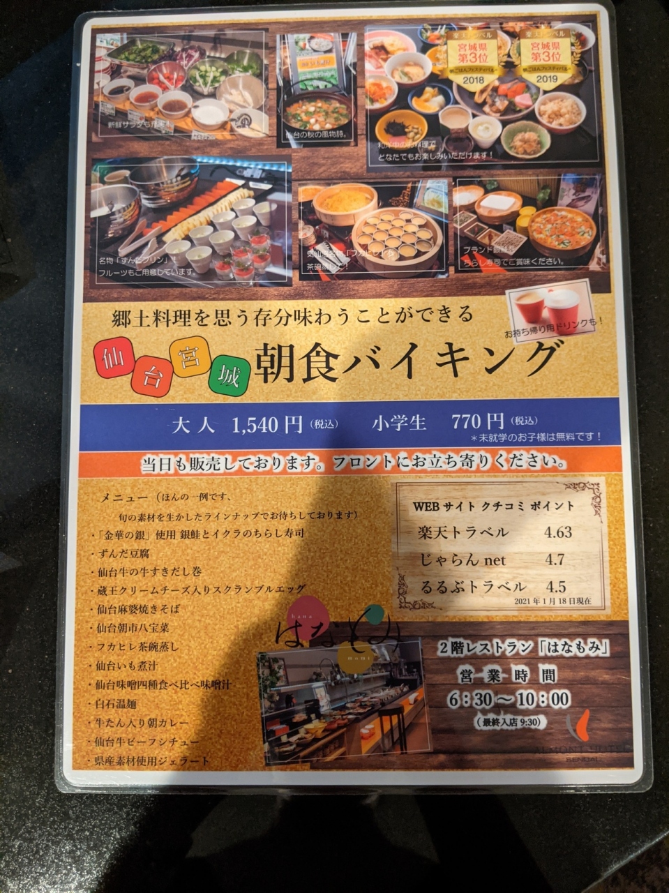 こじんまりとしたホテルで大浴場も広くはありませんが疲れを癒やすのには十分。朝食は仙台ならではの郷土料理やスイーツが充実していて評判通り、とても美味しかったです。価格もリーズナブルなのでまた利用したいです。- 旅行時期