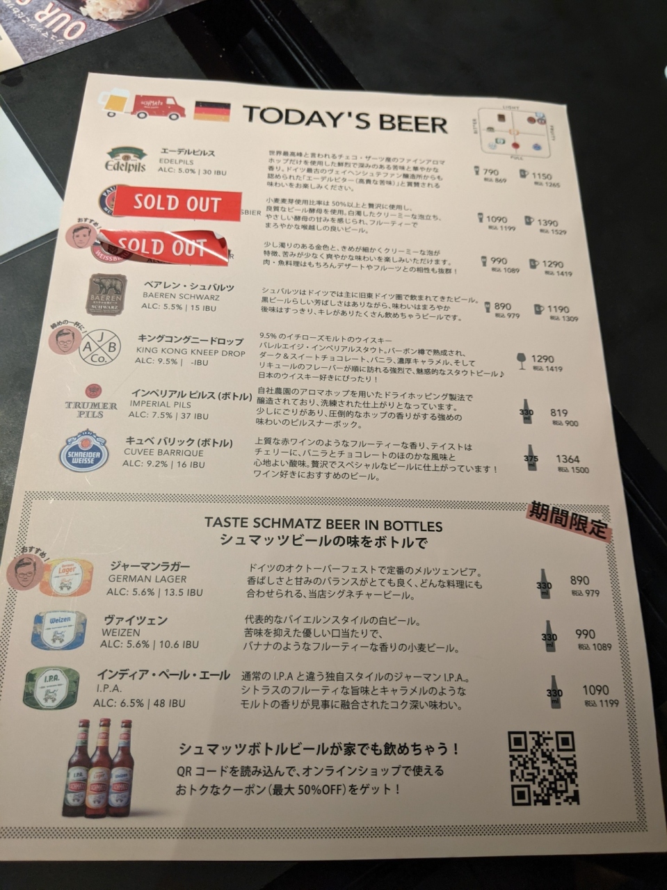 有楽町駅から東京駅方面に少し進んだJRのガード下にあるドイツビールのお店。注文の際にビールの説明をしてくれます。この日のビールは7種類、それぞれに説明書きもあるので好みのビールに出会えそうです。