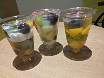 ホテルで食べるデザートを探してぶらぶらしていて見つけたフルーツカフェ。店頭の冷蔵ケースには美味しそうなフルーツデザートが並んでいました。季節のフルーツを使ったゼリーやフルーツポンチ、杏仁フルーツ。どれもフルーツたっぷりで美味しかったです。