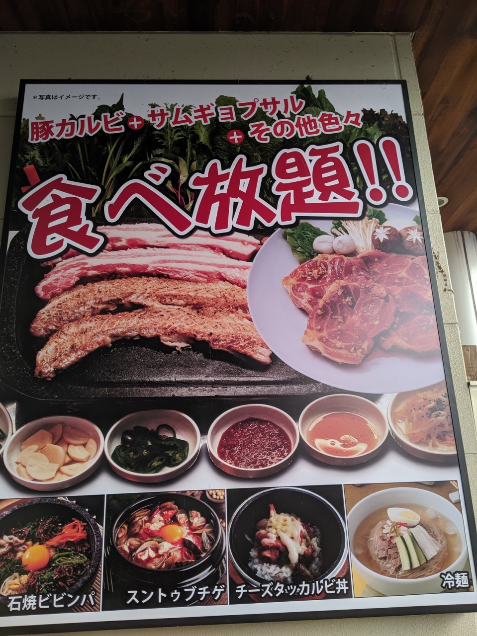 イオンレイクタウンのMORIガーデンウォークにある韓国料理のお店。食べ放題でなくても良かったのですが…韓国料理が食べたかったので入店。お肉はサムギョプサルと豚カルビ、プルコギが食べ放題。ほかにもサラダ、チヂミやトッポギ、チャプチェといったサイドメニューも豊富でした。お味は特別美味しいというわけではないけど合格点。1800円ですべて食べ放題なのはコスパが良いかなと思います。
