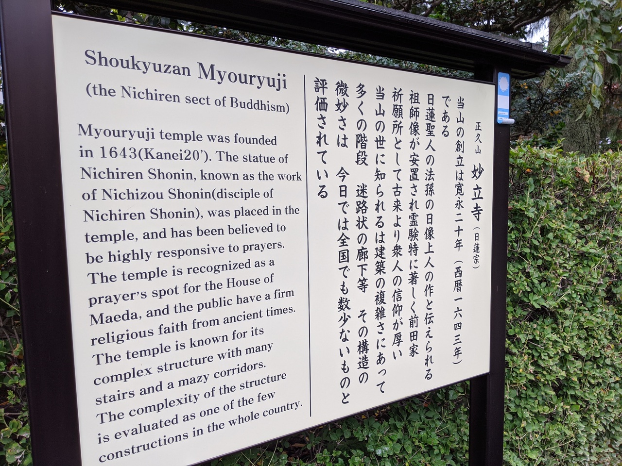 別名「忍者寺」と呼ばれるお寺を知人に勧められて訪問。予約が必要とのことだったので当日の朝に電話で予約しました。いくつかの組に分かれて説明を聞きながら見学しますが、敵から身を守るために様々な仕掛けが施されていてとても面白かったです。