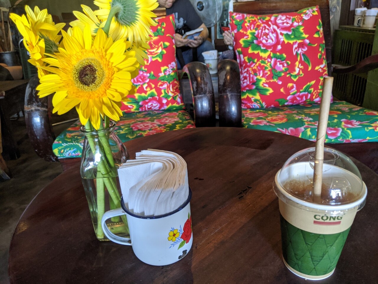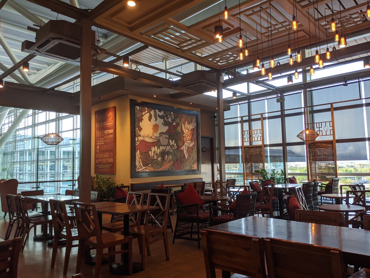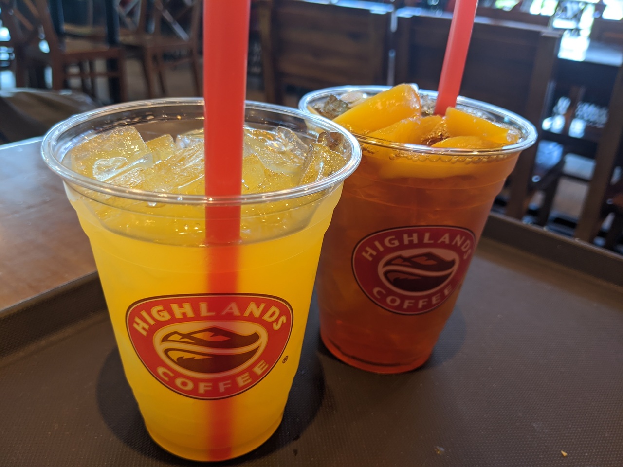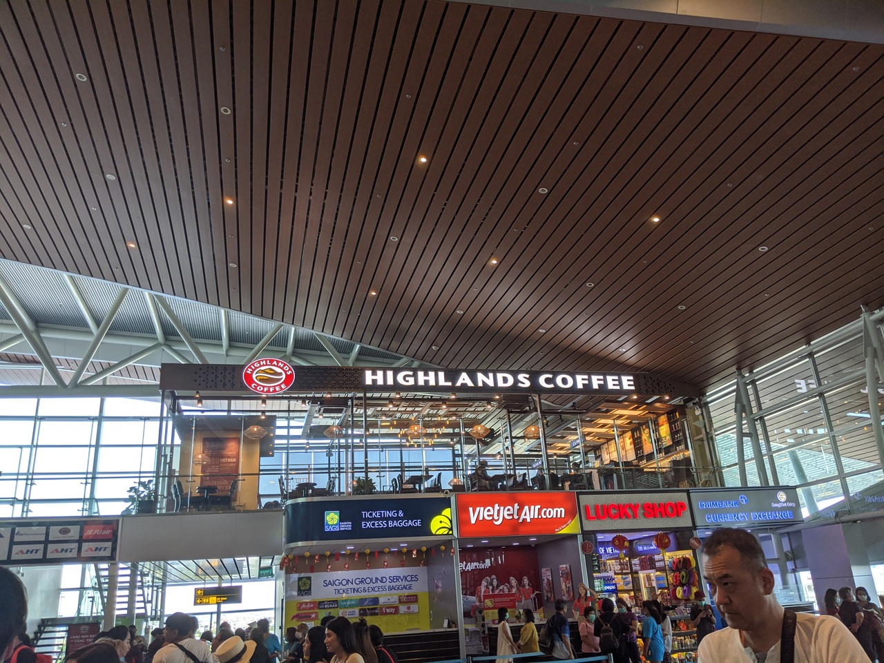 ベトナムのコーヒーチェーン、ハイランズコーヒーのダナン国際空港店は出発ロビー階にあるので空港カウンターでチェックインを待つ間に最後にベトナムコーヒーを味わうことができます。中2階のような位置にあるのでロビーを眺めながら過ごせます。価格は空港価格?街中のハイランズコーヒーより高かったです。