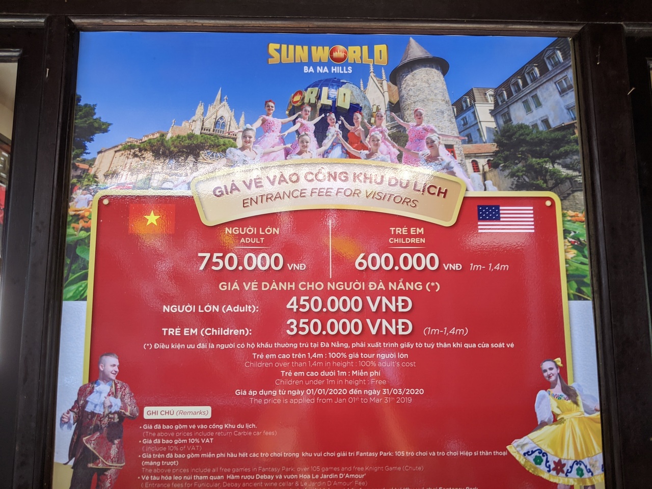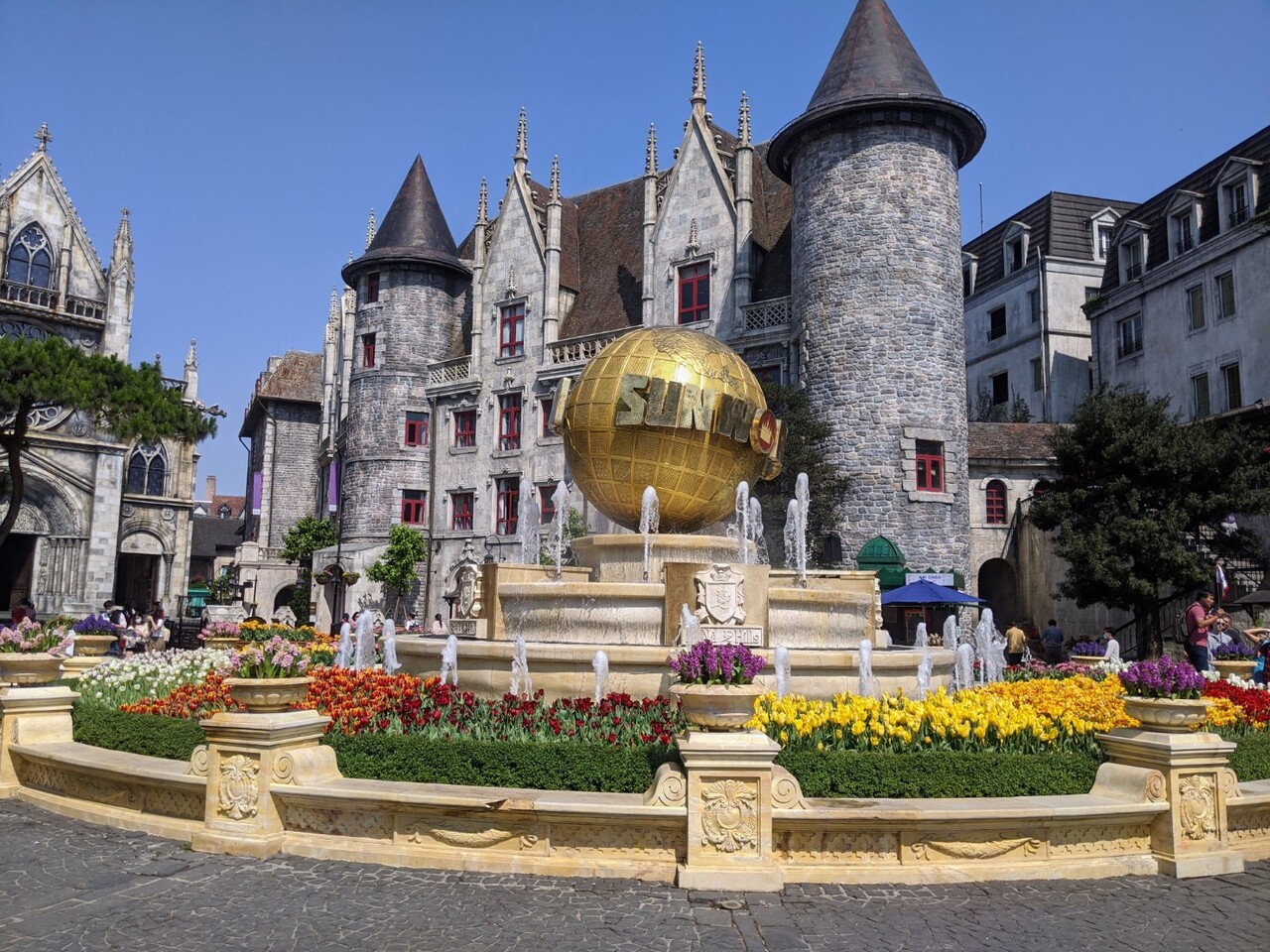 神の手と言われる手にささえられるゴールデンブリッジが有名ですが橋も含めて巨大な敷地に広がるテーマパーク。ロープウェイで山頂へ行くとフランスの町並みを散策できます。悪天候でもokな屋内遊園地のようなゾーンもあり、75万ドン(約3700円)と高めの入園料ですが、一見の価値はあります。