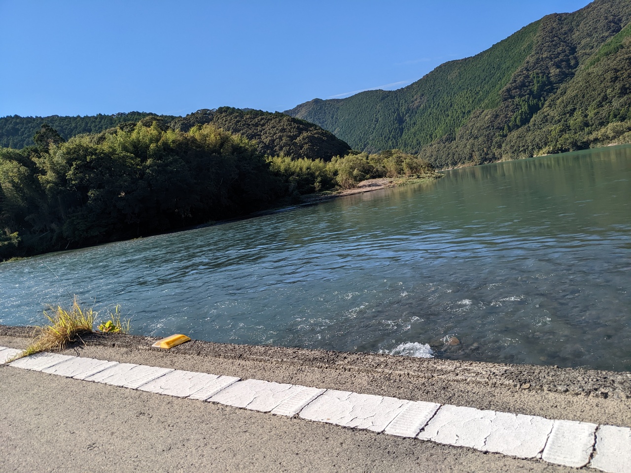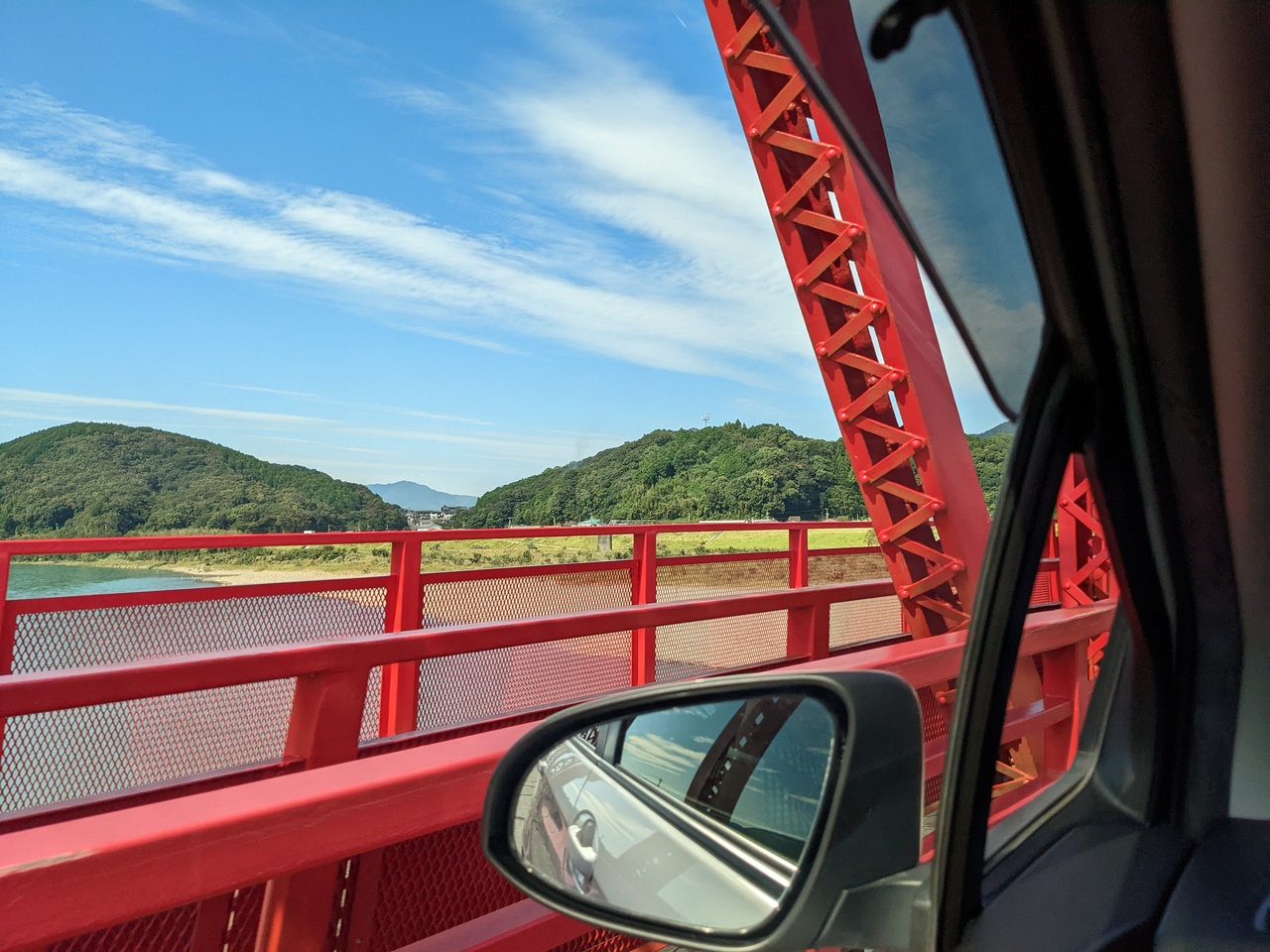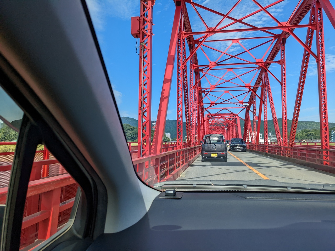 四万十川の河口から9km、四万十市中村地区の中心部に掛かる赤い橋。遠くから見てもすぐわかる真っ赤な鉄橋です。四万十川橋が正式名称のようですが「赤鉄橋」と呼ばれているようです。お天気の良い日に通ったので赤い橋と青い空、青い川がとても美しかったです。