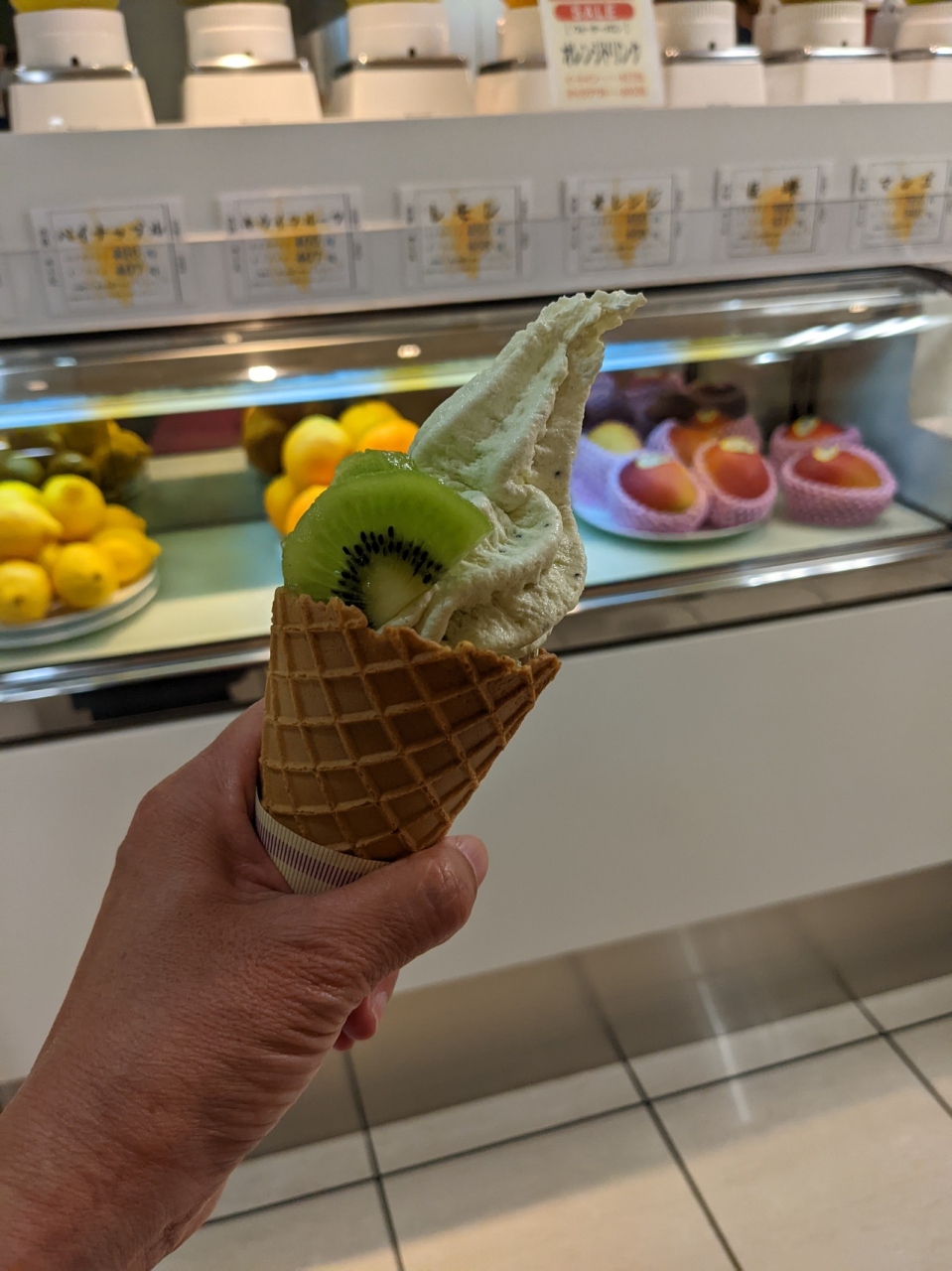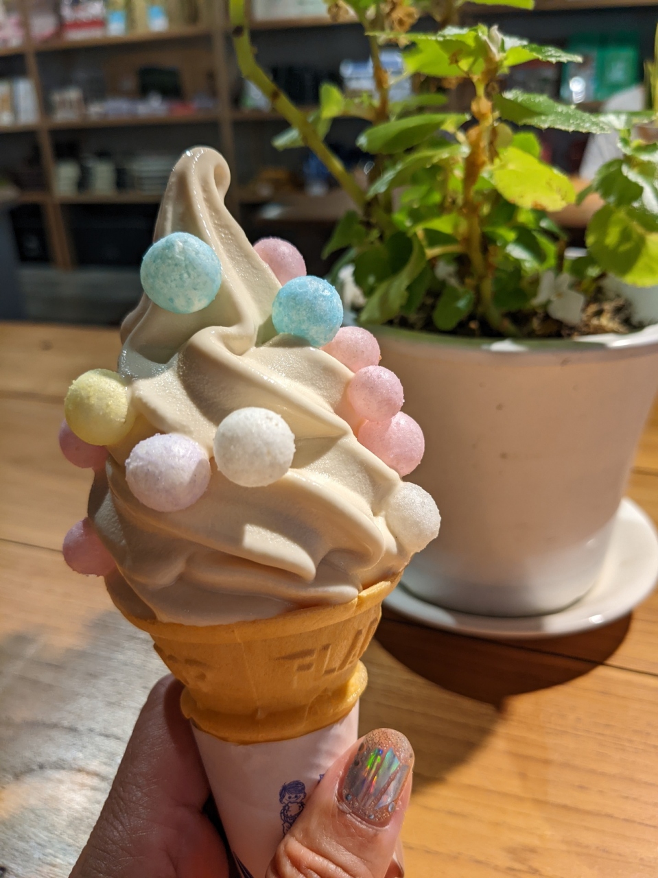 店名がうどん学校なだけにうどん打ち体験などができるようですが、今回はお参り後の休憩で立ち寄り、和三盆ソフトクリームにお入りをトッピングしたものをいただきました。優しい甘さの和三盆ソフトにかるーい食感のお入りの相性がよくとても美味しかったです。お土産物も充実していました。
