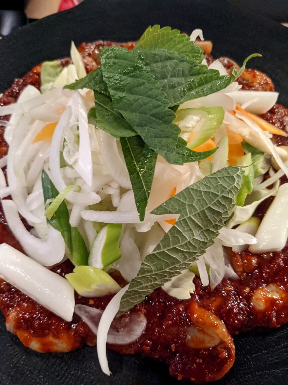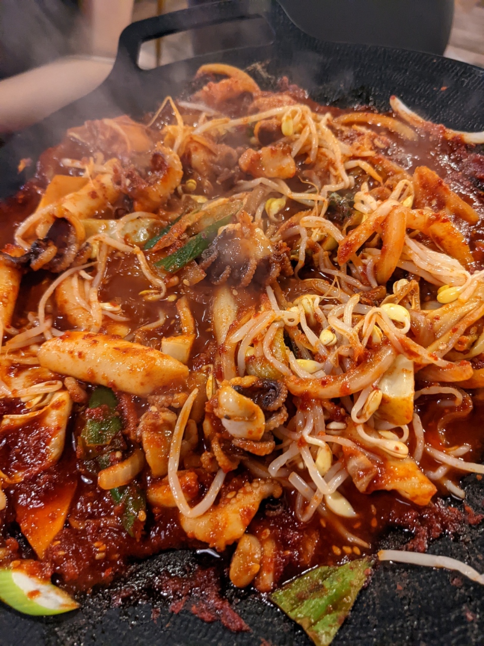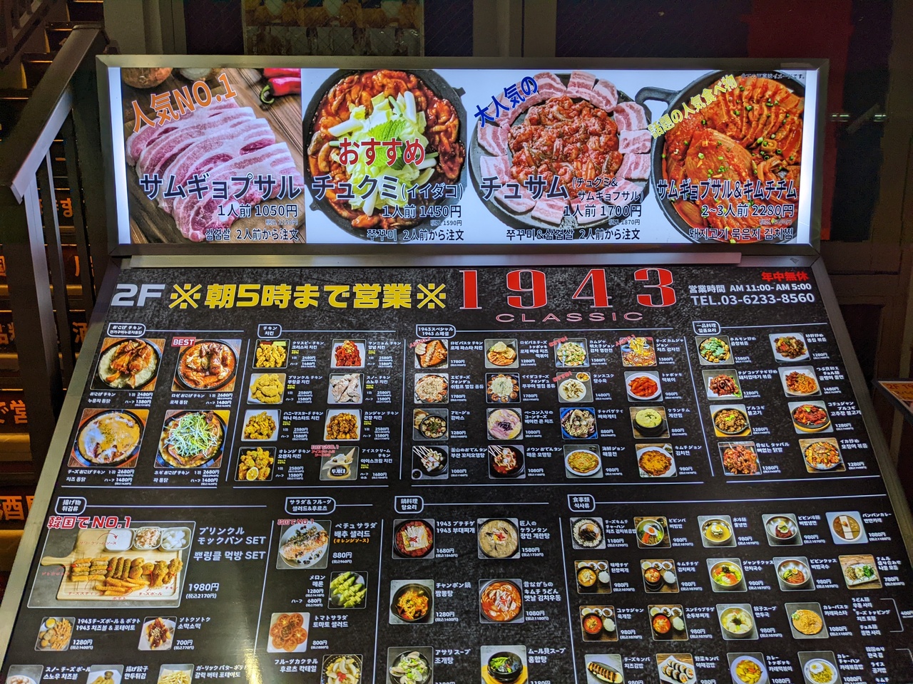 新大久保駅からすぐ近くのビル2階の居酒屋さん。韓国で人気の居酒屋チェーンのようです。入口の看板のチュクミ(イイダコ炒め)に惹かれて入店。店内は広く、シャンデリアがあったり居酒屋っぽくない雰囲気。お目当てのチュクミは程よい辛さで〆のご飯まで美味しくいただきました。