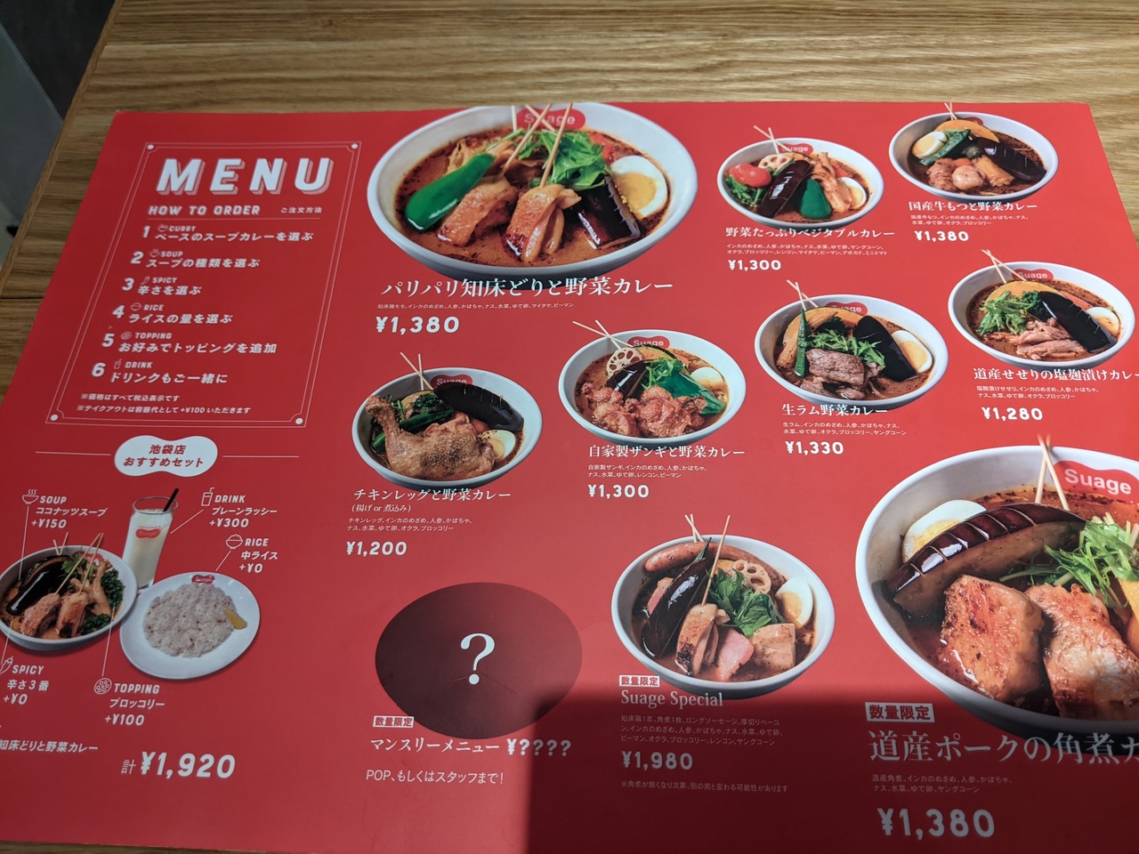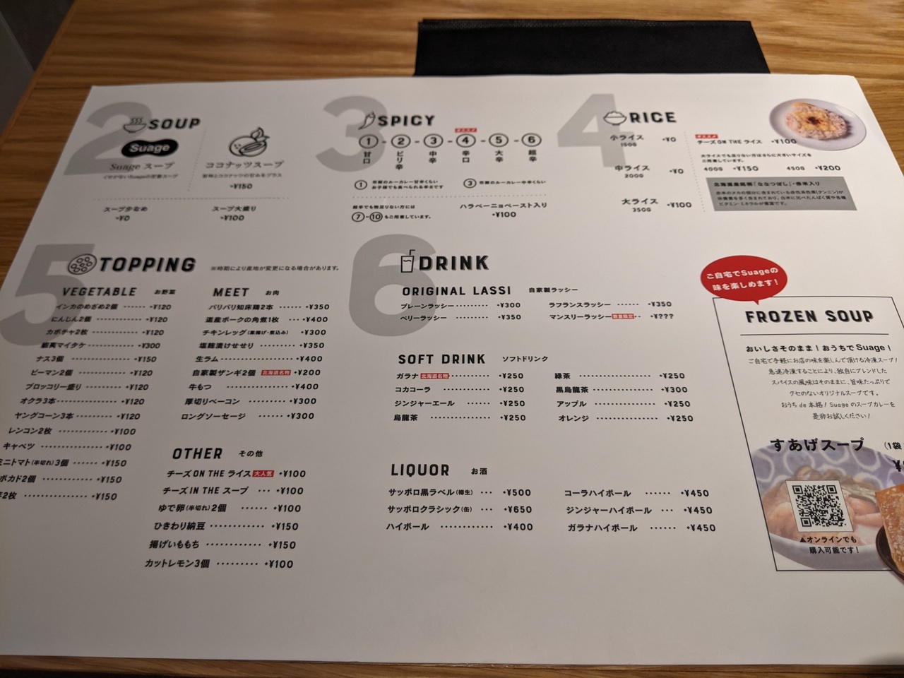 東京にもすでに何店舗か出店している札幌発祥のスープカレー店が池袋東武の12階にオープンしました。まずはメインのカレーの種類を選び、スープはオリジナルのSuageスープかココナッツスープから選択。次に辛さとごはんの量は決めます。