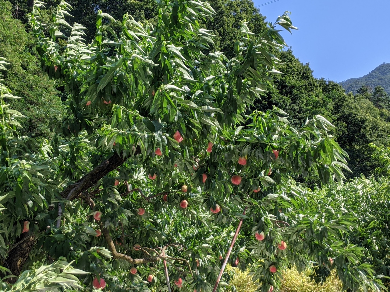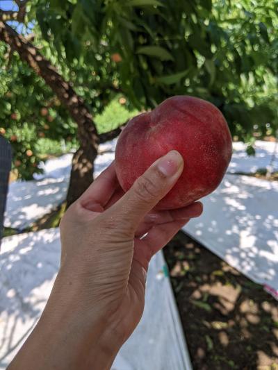 7月の連休に予約もせず桃狩りへ。2店舗は予約でいっぱいと断られましたが、こちらは予約なしでもOKでした。(空き状況次第のようなのでやはり予約はした方が安心だとおもいます)お店から畑までは車で送迎、食べ放題、時間制限なしで1500円でした。山梨の桃は硬い!とのことでリンゴのような食感でしたが甘くて美味しかったです。